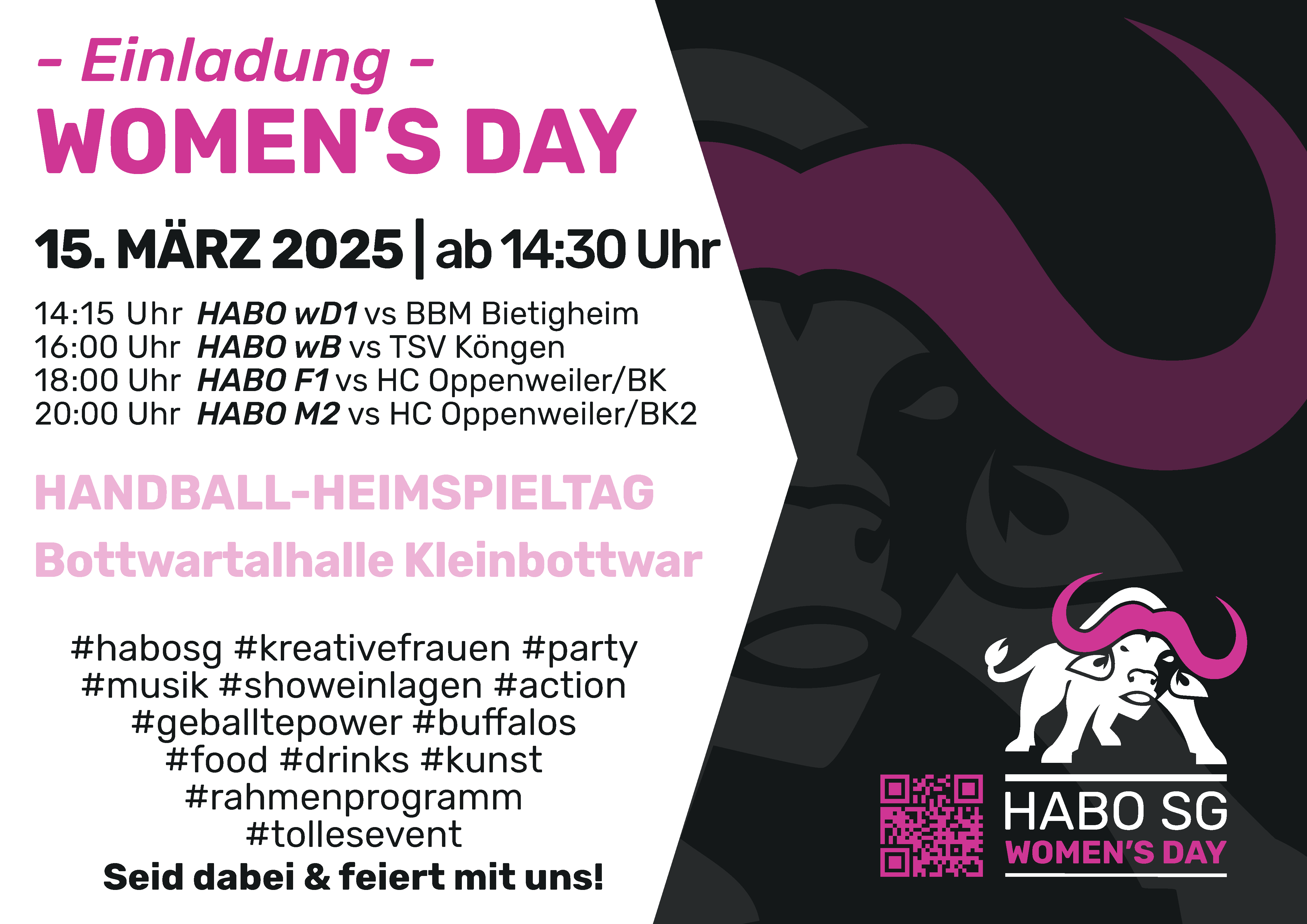 Im Zuge des Weltfrauentags lädt die HABO SG Buffalos am 15. März 2025 zum zweiten HABO Women’s Day in die Bottwartalhalle in Kleinbottwar ein. Dieses besondere Event feiert starke Frauen im Sport und in der Gesellschaft – mit packenden Handballspielen, spannenden Interviews und einem abwechslungsreichen Rahmenprogramm.