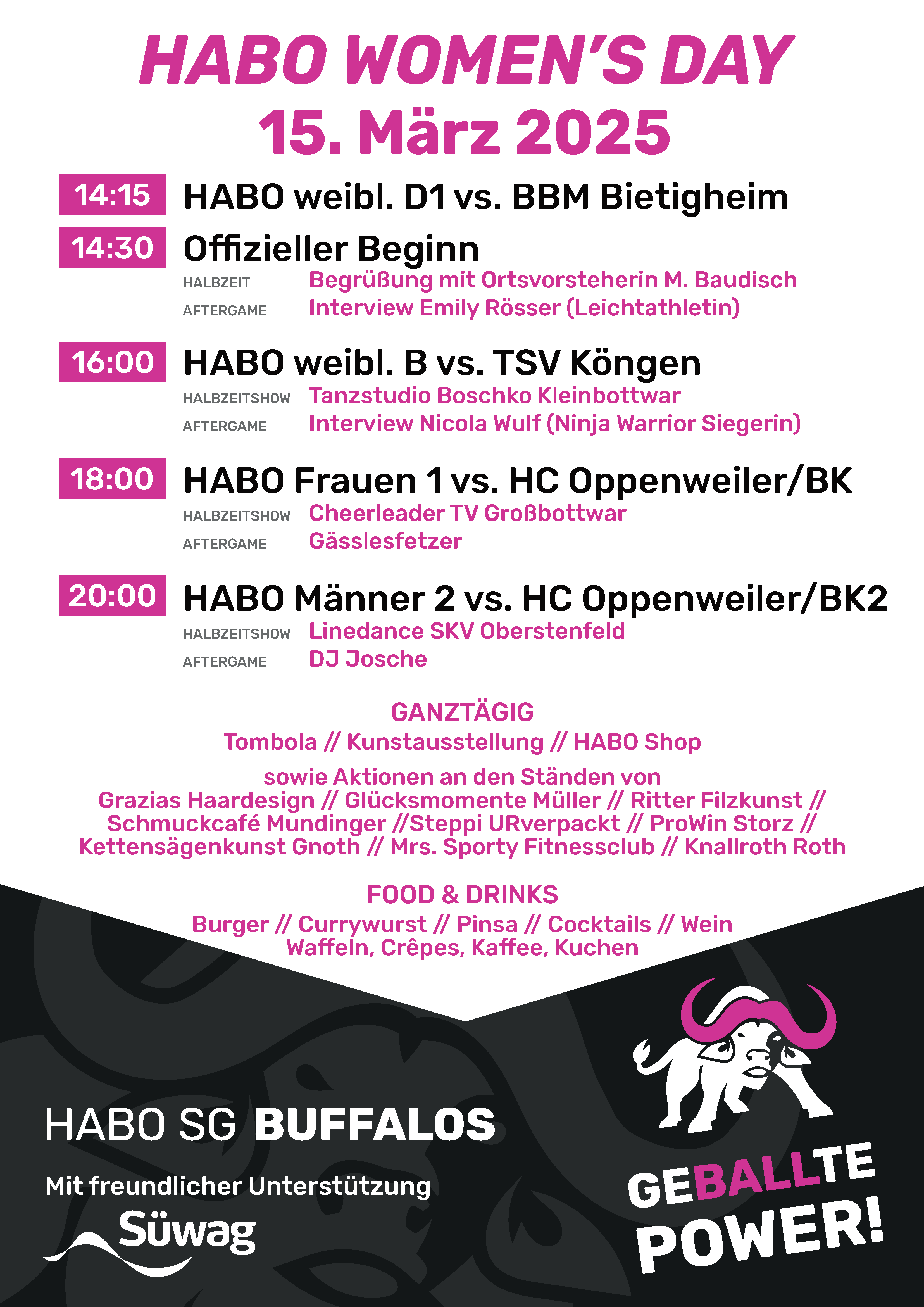 Der Tag beginnt um 14:15 Uhr mit dem Duell der weiblichen D1 der HABO gegen die  SGBBM Bietigheim, gefolgt vom offiziellen Beginn um 14:30 Uhr, zu dem die Leichtathletin Emely Rösser im Interview zu Gast ist. Weiter geht es mit den Begegnungen der weiblichen B-Jugend gegen den TSV Köngen (16:00 Uhr) und dem hochklassigen Spiel der HABO Frauen 1 um 18 Uhr gegen die HC Oppenweiler/BK an. Den Abschluss bildet um 20 Uhr das Duell der Männer 2 ebenfalls gegen das Team aus Oppenweiler.